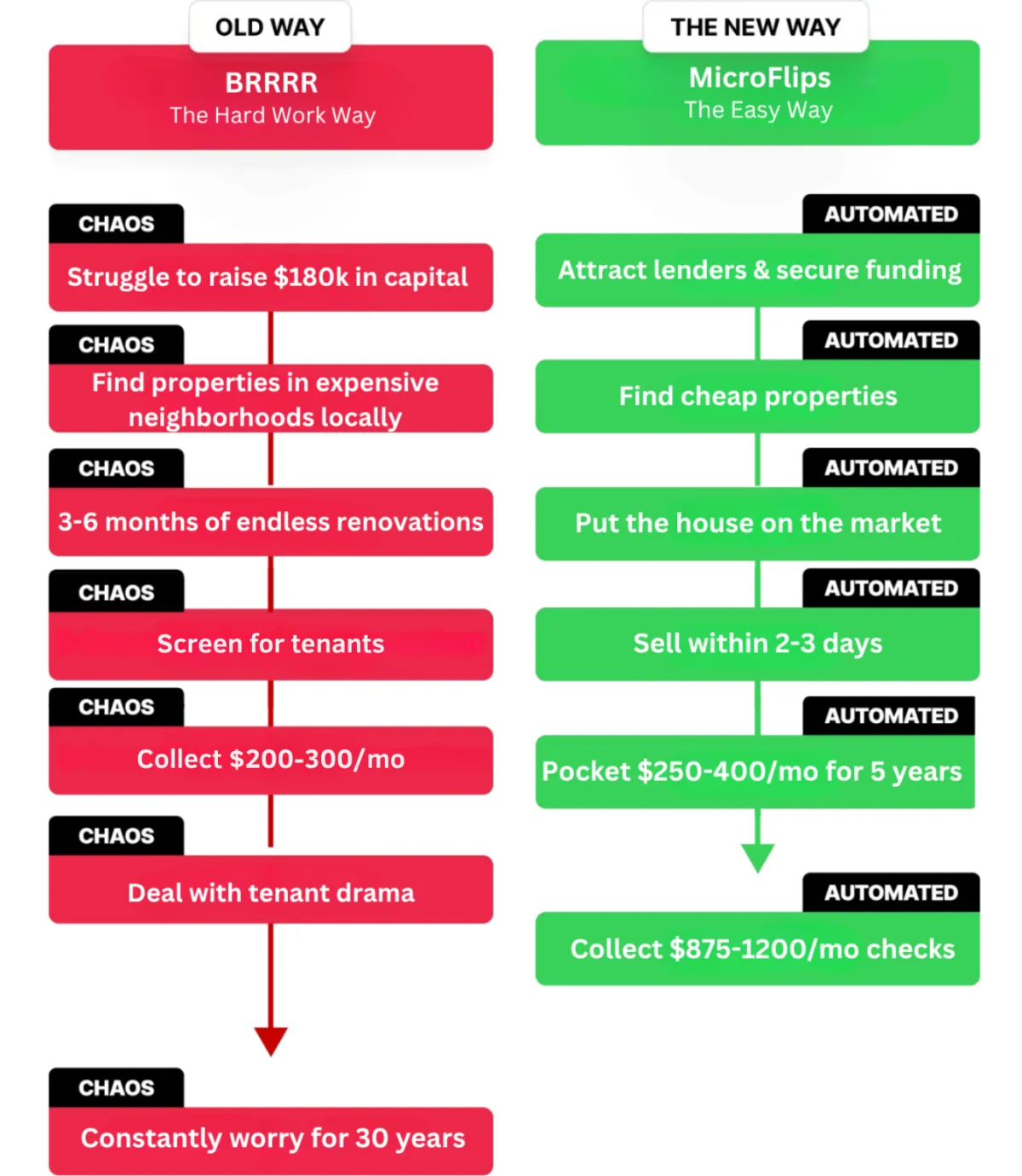 The MicroFlip Method is an eBook and a systematic approach to building a proven property flipping business. It is not a fad that comes and goes. It is not helping you to start a new job. No. This is about automation and freedom. The MicroFlip Method is about building a remote real estate business that can be around for years to come. It will give you not just freedom and profit, but you'll also have the opportunity to sell the business.